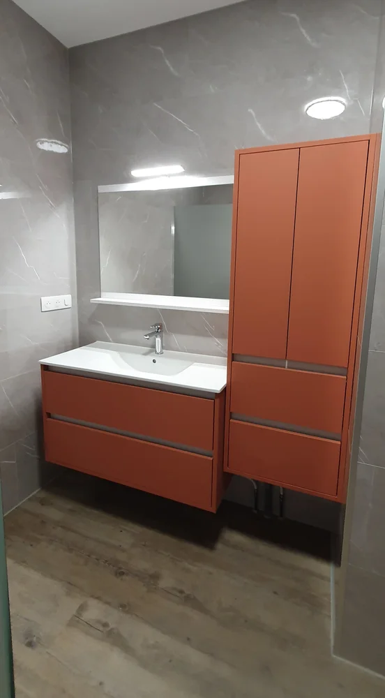 Nos clients souhaitaient donner un coup de jeune à leur salle de bain, et nous avons relevé le défi avec brio. Nous avons procédé à une transformation complète de l'espace vasque, en commençant par le retrait de l'ancien mobilier. Le nouveau meuble vasque, choisi dans une élégante couleur terracotta, est désormais accompagné de luminaires modernes, d'un miroir design et d'une grande vasque. Les murs ont été revêtus de dalles grises, et le sol a été entièrement refait pour un rendu à la fois confortable et optimisé.