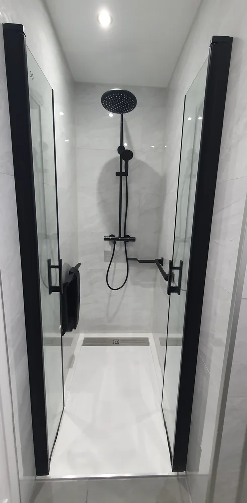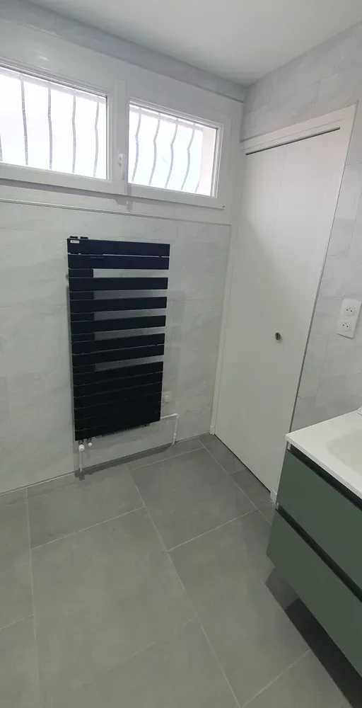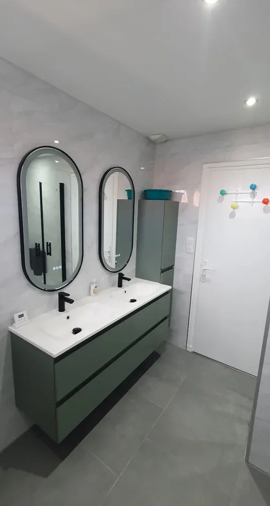 Le projet a débuté par la démolition de l'existant, une baignoire aux coloris peu modernes. Nous avons opté pour des matériaux modernes tels que le gris, associé à une peinture blanche pour apporter luminosité et élégance. La robinetterie noire et les parements de murs couleur marbré ajoutent une touche de sophistication. La douche est équipée d'une porte oscillobattante noire, un choix esthétique et pratique.