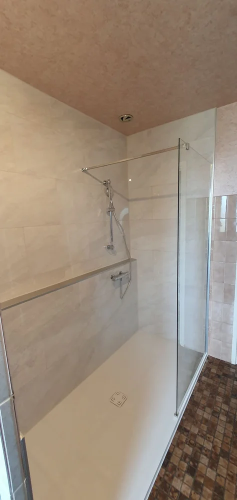 Dans cette salle de bains, nous avons installé une douche qui occupe toute la longueur du mur, équipée d'une paroi fixe et d'un receveur extra-plat. Ce design maximise l'espace disponible et améliore l'accessibilité. Le long du mur un support en aluminium a été ajouté pour offrir un espace pratique pour les produits de douche. Cette transformation illustre notre capacité à optimiser l'espace tout en assurant un confort accru.
