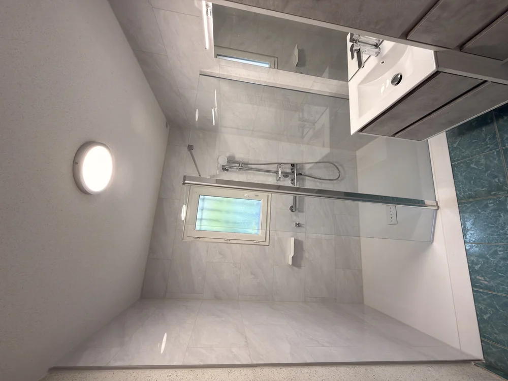 Dans cette rénovation, nous avons procédé à une dépose complète : la baignoire, les carreaux de faïence, le meuble vasque, le miroir, tout a été retiré, sauf le sol. À leur place, nous avons installé une jolie douche spacieuse et lumineuse. La fenêtre existante a été conservée pour profiter de la lumière naturelle, et des luminaires ont été ajoutés pour apporter une clarté supplémentaire.