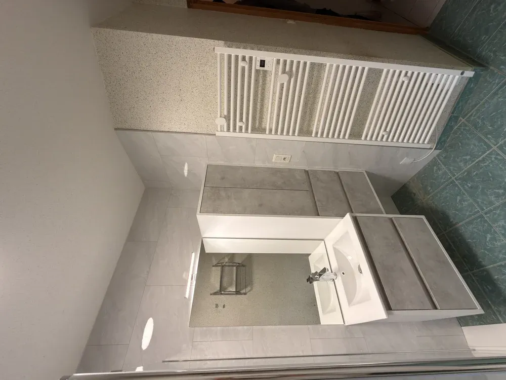 Les murs ont été habillés de dalles colorées gris-clair, apportant une touche moderne et élégante à l'espace. Le nouveau meuble vasque, très fonctionnel, offre de nombreux rangements, optimisant ainsi l'espace disponible. Un soufflant, radiateur en forme de sèche serviette, a également été ajouté pour un confort optimal.
